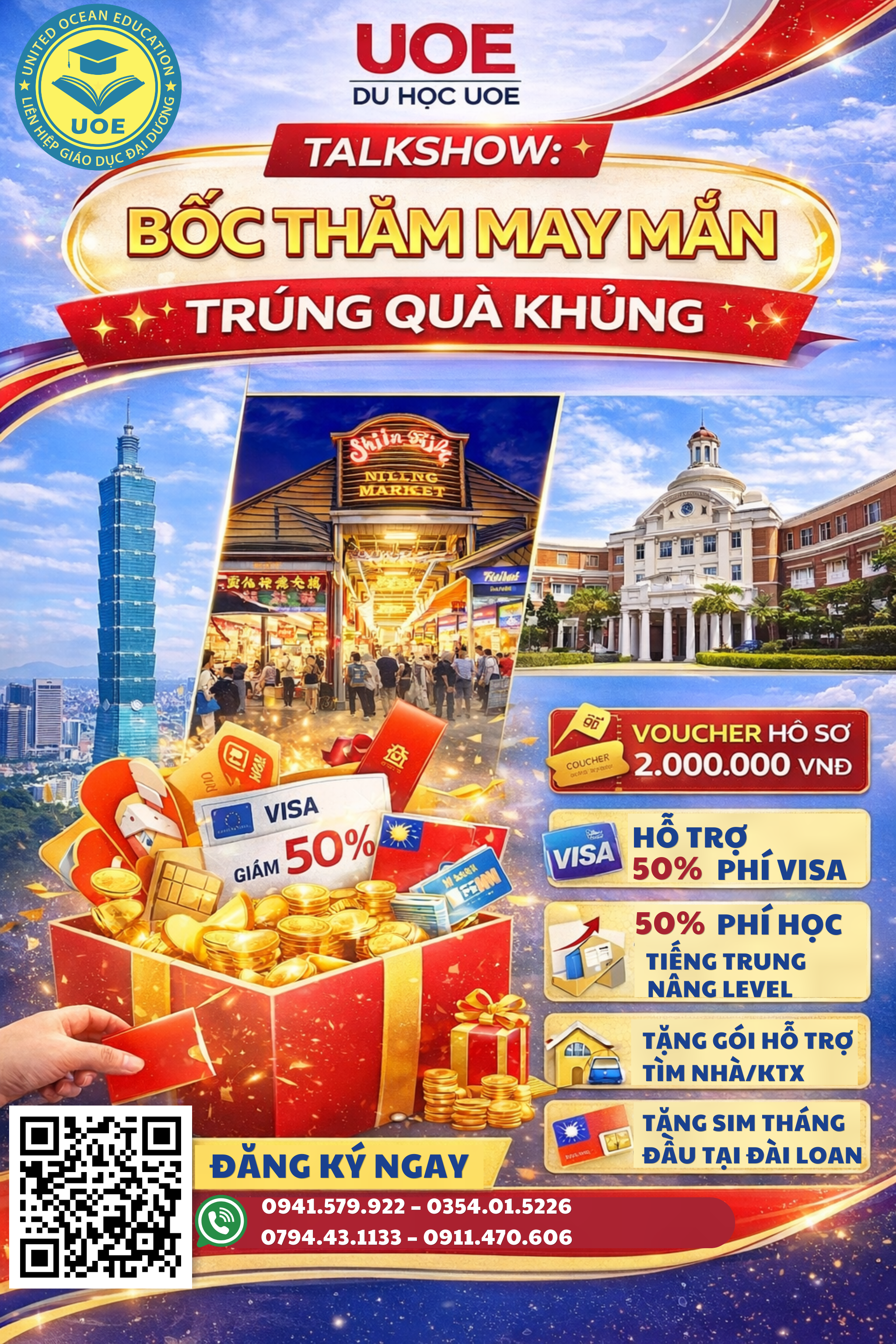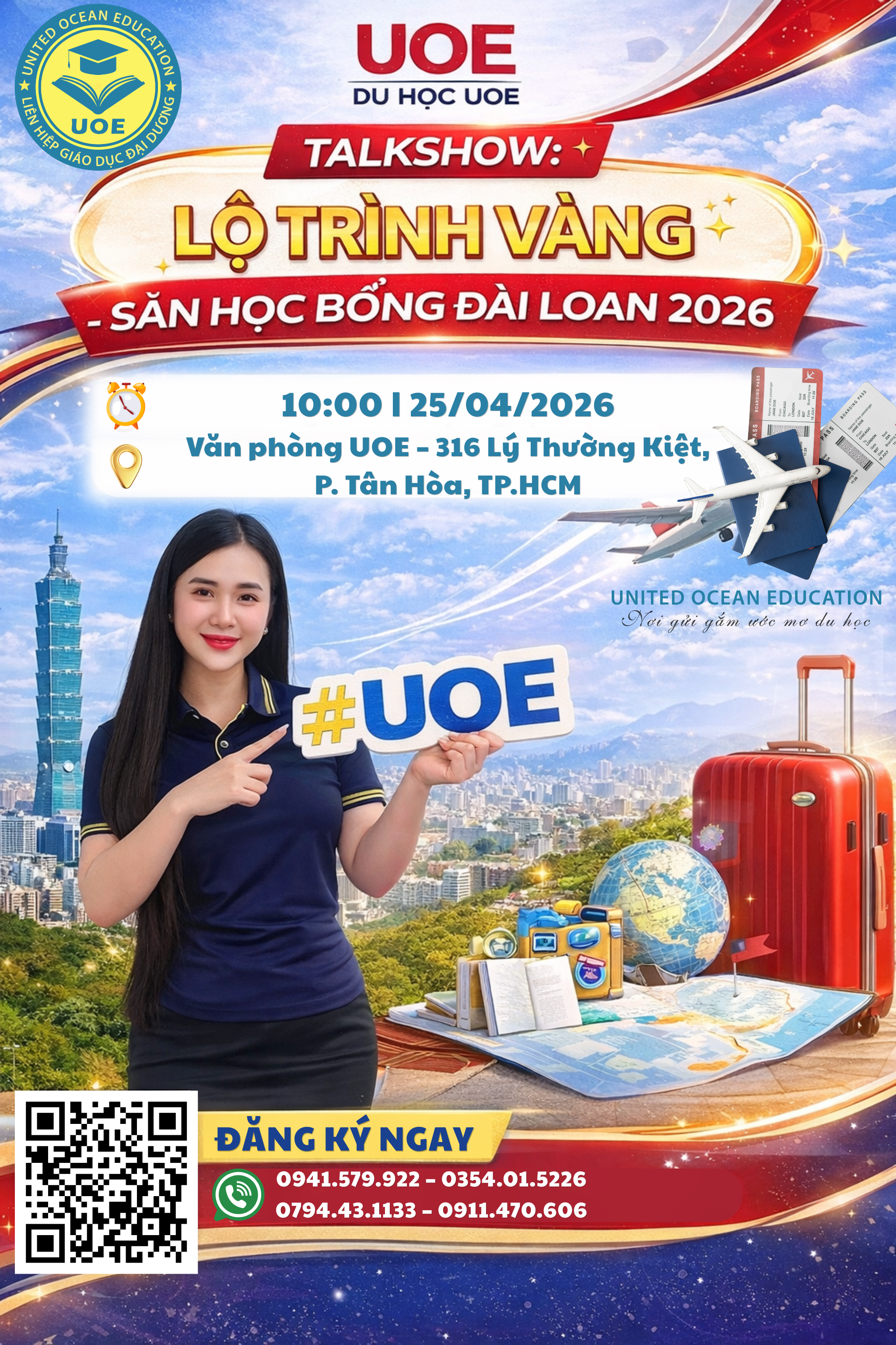 Liên hệ trực tiếp cho Du học UOE hoặc đăng ký tại << Tham gia Talkshow >> để giữ chỗ tham dự nhé. Đừng bỏ lỡ cơ hội nhận thông tin chính xác nhất. Và những ưu đãi giá trị nhất cho hành trình du học Đài Loan 2026 của bạn.